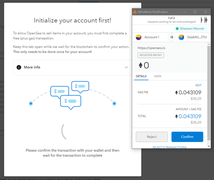 因为是首次在 OpenSea 上出售 NFT,平台要求我们完成一笔免费交易,用于初始化账户。但这笔交易会附加一个矿工费 (gas fee)。