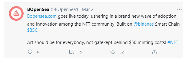 有人把数学家欧拉的公式创作成歌曲,以 EulerBeats 的身份发表在以太坊上以 NFT 出售,结果 BSC 上出现了完全相同的作品,发表者为 MusicalBeats;Larva Labs 发布的数字头像合集 CryptoPunks,也被一个名叫 Binance Punks (Bunks) 的账号盗版了(后来甚至还出现了波场版本 Trunk);就连币安的 NFT 交易所也叫 BOpenSea……