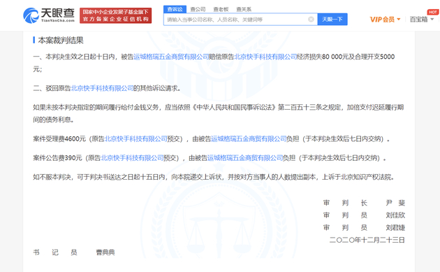 最终,本案裁判结果为:被告运城格瑞五金商贸有限公司赔偿原告北京快手科技有限公司经济损失80000元及合理开支5000元等。
