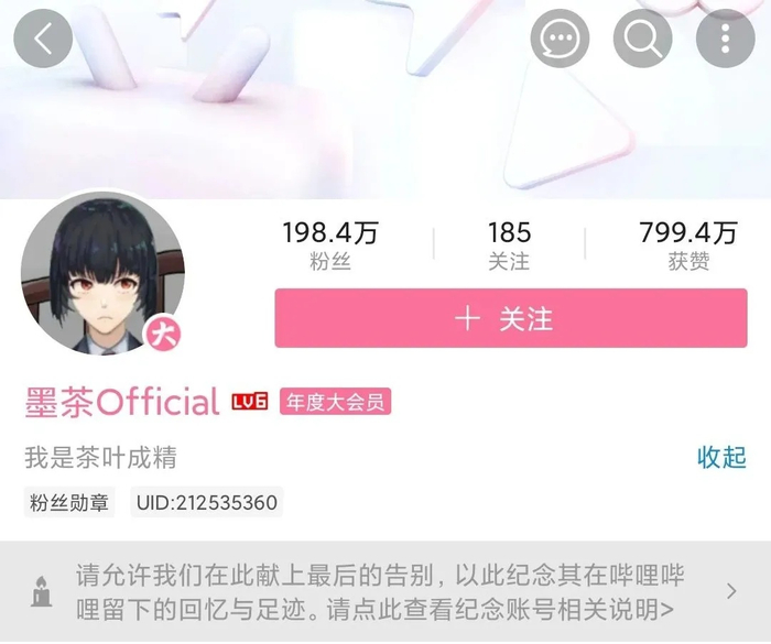 打开B站Up主“墨茶Official”的个人空间,官方纪念账户标识列在基础信息下,“请允许我们在此献上最后的告别,以此纪念其在哔哩哔哩留下的回忆与足迹。”