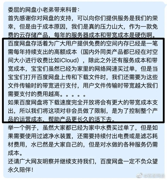2019年,在回复一条质疑网盘下载速度的微博时,百度网盘官微进行了“统一科普”,称“百度网盘为广大用户提供免费的空间内存,已是一笔需每年持续支出的高额成本”。