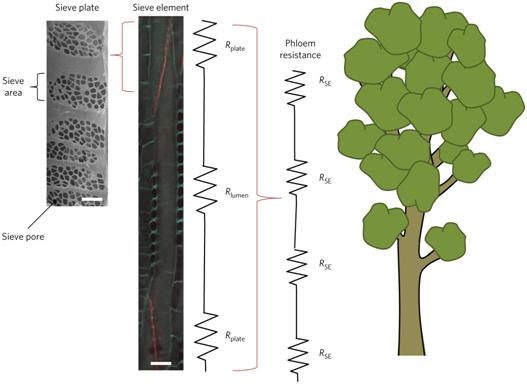 树木高度和树叶大小之间的联系与树木维管系统中能量的载体——糖的流动有关。树叶勤勤恳恳地通过光合作用操持着产糖生意,随后叶片将这些糖分通过韧皮部的筛管(维管组织之一)输送至整个树干,直至树根。但叶片阻力和树干阻力的存在,让这一运输过程关卡重重,为了顺利通航,每过一关都不得不消耗树总糖分产量的三分之一。