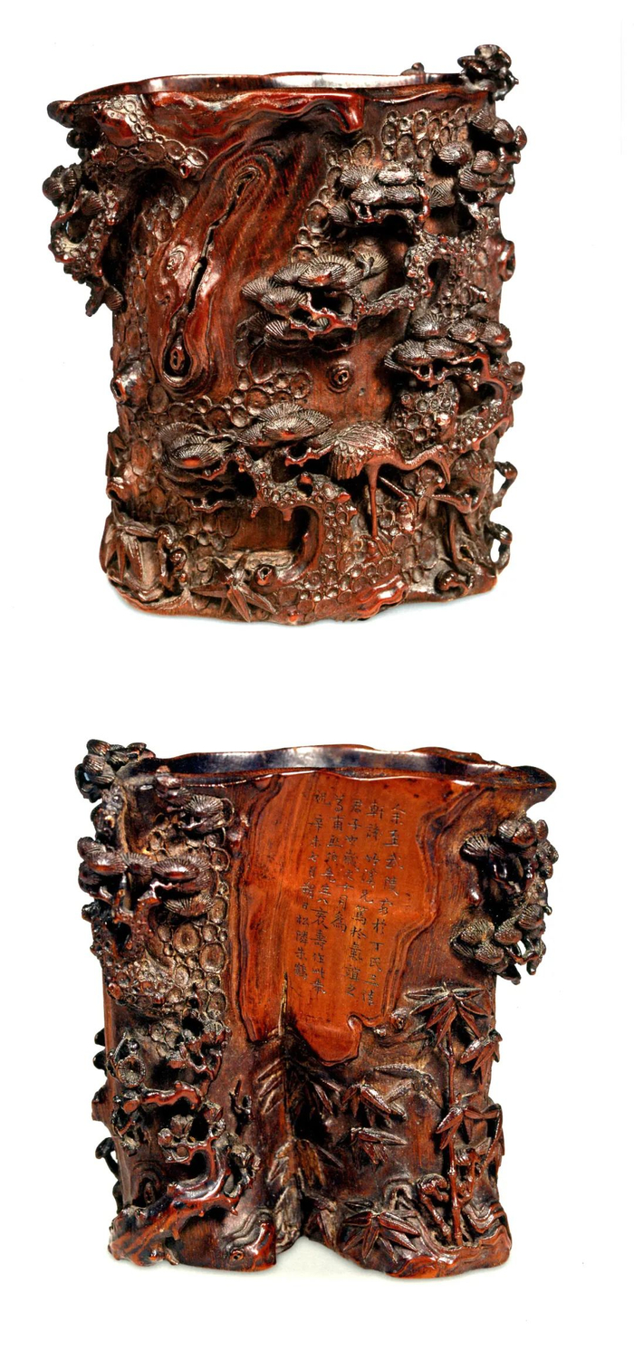 朱鹤存世有年款的竹刻作品基本为赝品,而此件松鹤笔筒为目前文博界唯一被认可的朱鹤竹雕真迹,其重要性不言而喻。