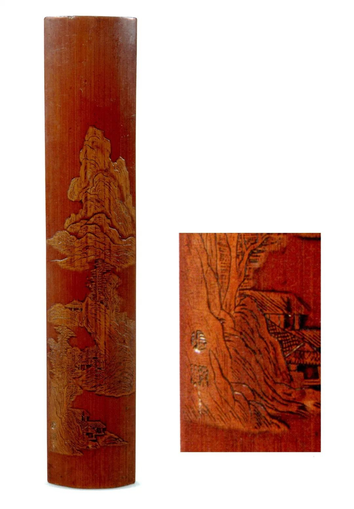 据徐建清在《南京博物院藏竹木牙角器述略》一文中介绍,朱鹤、濮仲谦外,南京博物院藏署款作品,声名颇著者有张希黄、吴之璠等名家,惜皆难以认定为真品。其中张希黄,是明代中晚期著名竹刻工,《竹人续录》里有载。据说“留青阳文”雕即“留青”刻法,始自希黄起;其刀工细腻、曲尽画理,善刻院派小景山水、楼阁最佳,常有诗题。 此次展出的张希黄款留青刻山水图竹臂搁取优质长节毛竹,斫两端竹节成长条形。留青薄意雕,其上施浅阴刻,刀法细腻。构图取法立轴式“南宗”山水,取高远法,远立怪石独兀山峰,中近景作一河两岸式岛岸与沙汀;其间古树丛叠,岸头、溪渚边有零星农舍、草庐。