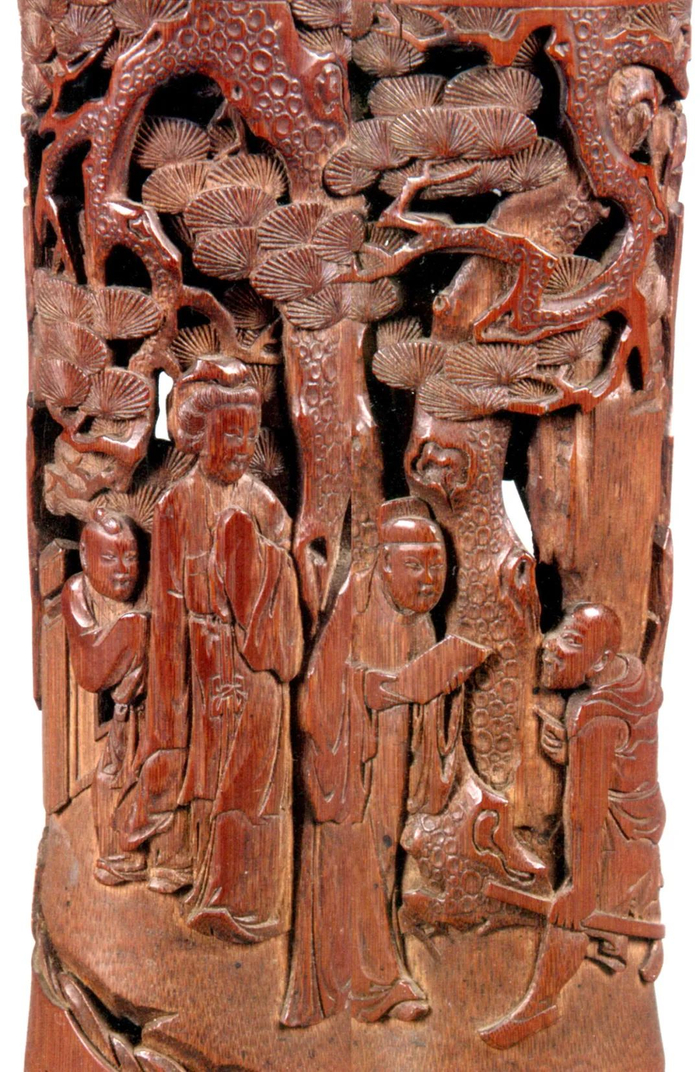 又如“柳毅传书”故事图竹香筒,香筒外壁周身以深浅剔底浮雕、镂雕技法而雕成。画面崖壁老松下,一位著幞头、圆领衫的书生,手捧尺牍一封屈身向前递与面对的持杖武者;武者髡发,左手执棒,右手指向书生,作询问状;书生身后松盖下,侧立一女子,裹巾、长裳,侧面向书生,面情略显焦躁;其身后有一位总髻童子,显天真童趣。画面所刻故事当为“柳毅传书”的爱情故事:持杖髡发武生为洞庭龙宫门侍,书生为柳毅,仕女为洞庭龙女。此件竹刻,奏刀简洁明快,深浅剔底层次明确,人物开脸颇为传神,当为明末清初嘉定一派良工所为。