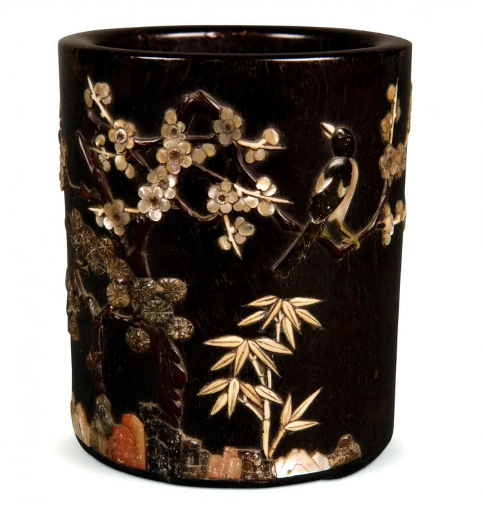 清中期 紫檀嵌百宝花鸟图 高14.5厘米 口径12.2厘米