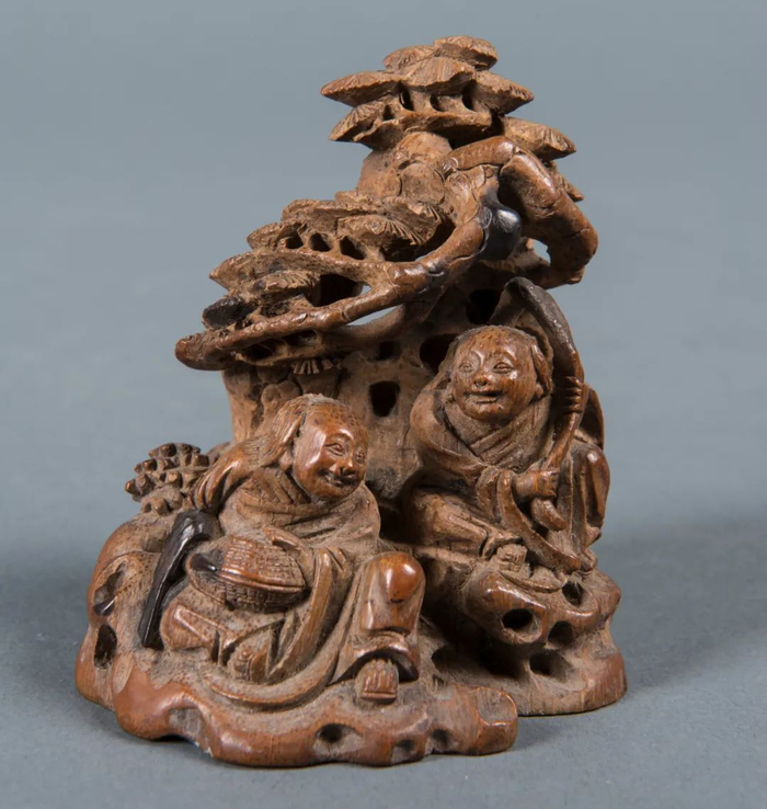除名家代表作品外,此次展览作品中亦不乏人物传说、成语故事等题材,折射出古代文人的审美与情趣。如圆雕的和合二仙嬉戏坐于山间石坪上,背靠老松,松下怪石嶙岣,寓意深山闲适。