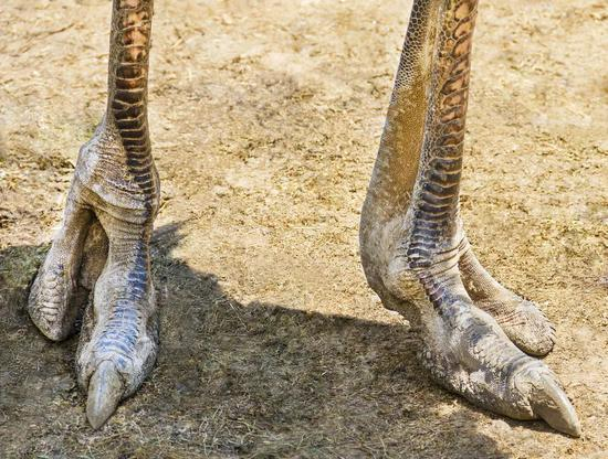 鸵鸟在遇到敌人时做的第一件事就是——跑。虽然它已经不具备飞翔的本领了,但凭借一双强有力的双足,鸵鸟冲刺的最大时速可以达到70千米每小时。鸵鸟所独有的只有两只脚趾的脚掌,也让他们更适应奔跑。