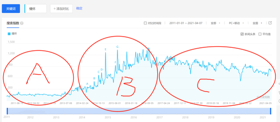情怀关键词的百度指数来看,从2011年至今,其曲线发展大致可分为三个阶段。