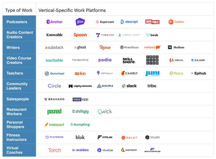 这张图表总结了在「创作者经济」时代兴起的专业的垂直工作平台|li.substack.com