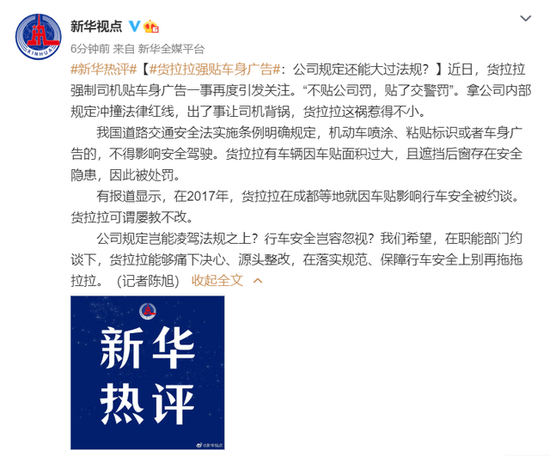 公司规定岂能凌驾法规之上?行车安全岂容忽视?我们希望,在职能部门约谈下,货拉拉能够痛下决心、源头整改,在落实规范、保障行车安全上别再拖拖拉拉。