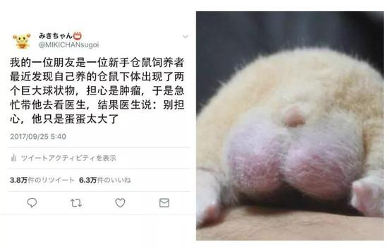 中国仓鼠的蛋蛋也是仓鼠家族中的翘楚。要知道成年中国仓鼠的体长是9厘米,但是它们蛋蛋的直径有2.5-3厘米,差不多是体长的三分之一。再加上中国仓鼠背部有着一条贯穿脊椎的深色条纹,和其他品种的仓鼠相比,公中国仓鼠的体型比较像“中”字,这就是中华家仓鼠的种族天赋吧。