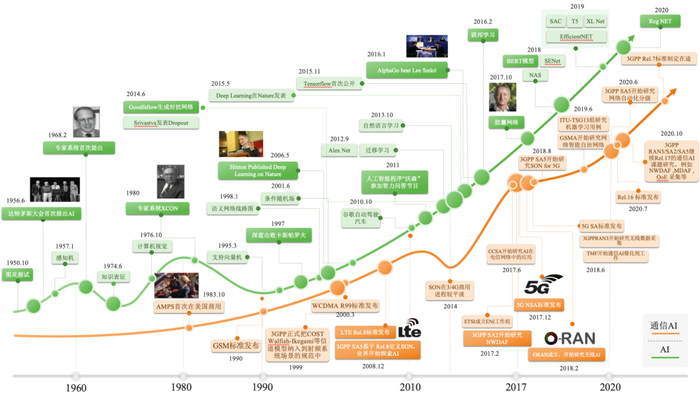 移动通信技术与人工智能在各自的早期阶段,都有着鲜明的、各自独立的发展路线。