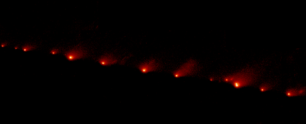 图中的冰冻碎片链(包含21个碎片,未全部展示)属于休梅克-利维9号彗星,长约710000公里,是地球到月球距离的三倍