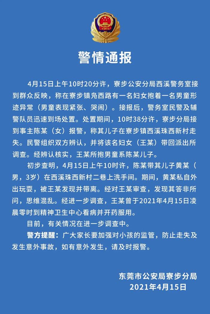 妈妈上洗手间3岁童玩耍被抱走,警方:抱人者当天服了精神药