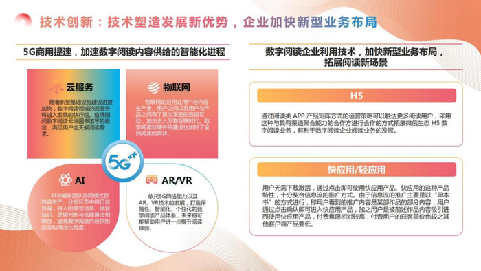 2020年是在行业发展上具有特殊意义的一年,疫情的爆发、5G商用的普及,加速了阅读从数字化向数智化转型。在此背景下,数字阅读行业不断探索“5G+”阅读模式, AI、AR、VR等新技术、新模式拓展了出数字阅读的新空间和新场景。