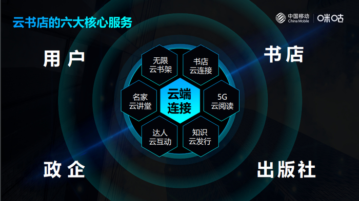 全场景的知识获取需要内容、人与渠道的连接。据介绍,以书的云端连接为核心,咪咕云书店拥有六大核心服务能力——无限云书架、名家云讲堂、达人云互动、知识云发行、书店云连接和5G云阅读。