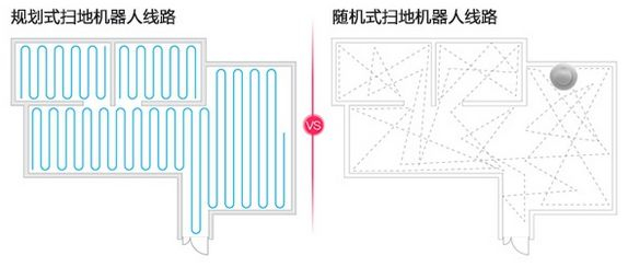 目前扫地机器人的清扫路线分为规划式和随机式。随机式清扫通常是依靠碰撞来改变行走路径的,容易造成漏扫,清洁效率低;而规划式清扫的扫地机器人可以感知四周环境,然后根据所规划的路径对各个区域进行有序清扫,不仅清洁覆盖率高,还完全不用人操心。