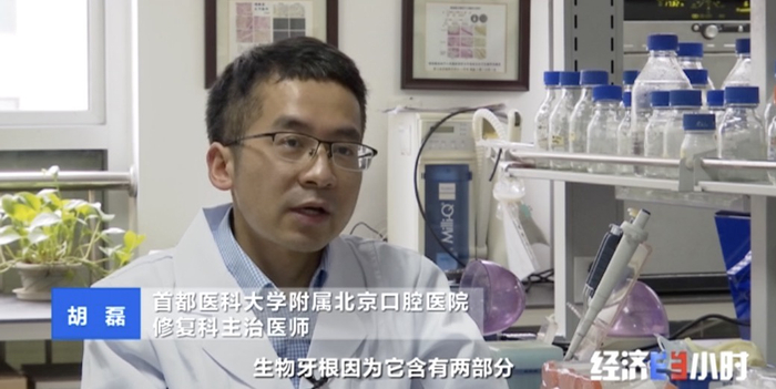 胡磊,王松灵的学生,2011年开始就进入了王松灵的课题组,胡磊告诉记者,生物牙根再生就好比盖房子的地基,只要牙根再生出来,他们就能把牙冠接出来,区别于现在的种植牙以螺纹钉为根基,生物牙根是利用干细胞再生出和自己牙齿接近的一种组织来支撑牙冠。