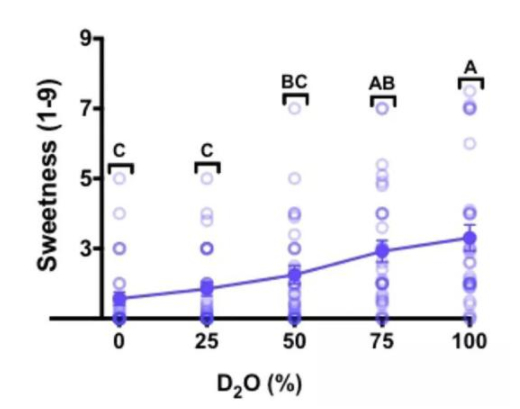 在另一项由娜塔莉·本·阿布主导的实验中,28名参与者在开鼻式味觉测试中有22名准确区分出了重水,根据他们的主观反馈,纯重水的甜味显著,但比较轻微,平均甜度为3.3±0.4(1无感,3轻微,5中等,7非常,9齁甜)。