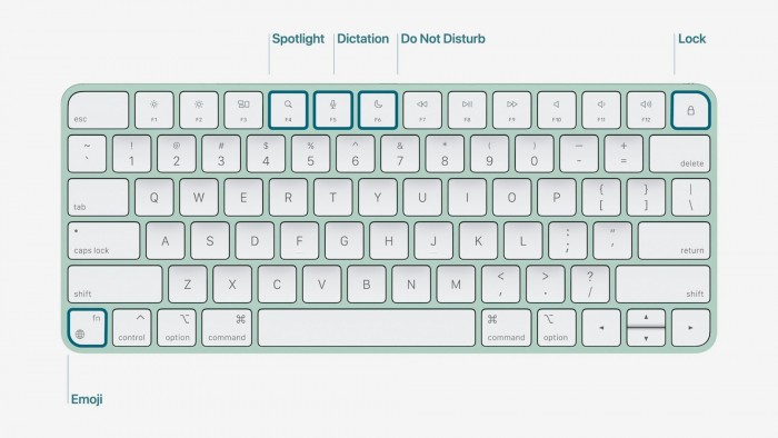 新的键盘还包括功能按钮,可用于触发Spotlight、听写和免打扰。在左下方,功能按钮也可以用来开始输入表情符号。苹果还将键盘的外壳设计成与iMac的颜色相匹配,以实现统一的外观。还提供了带有数字键盘的版本。