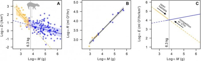 为了找到答案,京都团队研究了北美洲化石记录中野兔的进化,他们将其与生态因素的分析相结合。他们发现在体型和与有蹄类动物(或有蹄类食草动物)的竞争之间存在着联系。当蹒跚学步的动物变得大于 13 磅(6公斤)时,它们的能量效率就会低于有蹄类动物,使后者具有竞争优势。因此,一个地区最小的有蹄类动物控制着最大的蹄类动物能长到多大。