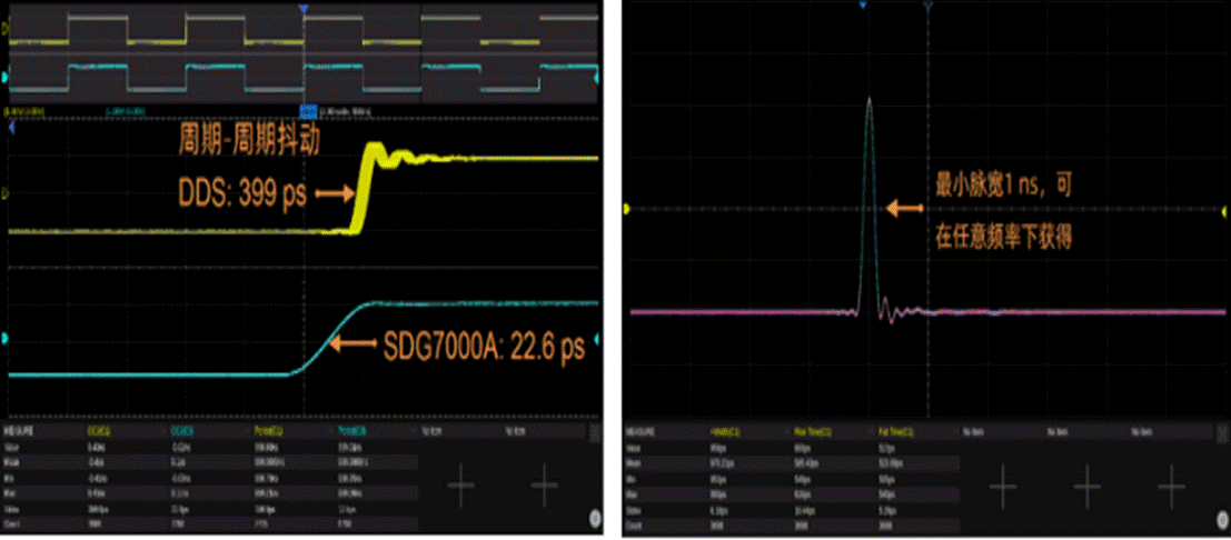 采用鼎阳TrueArb逐点任意波形发生技术,SDG7000A可以在1 μSa/s ~ 2.5 GSa/s的范围里任意设置采样率,输出低抖动的任意波。基于鼎阳成熟的EasyPulse脉冲发生技术,它可以产生脉宽最小只有1 ns的脉冲。