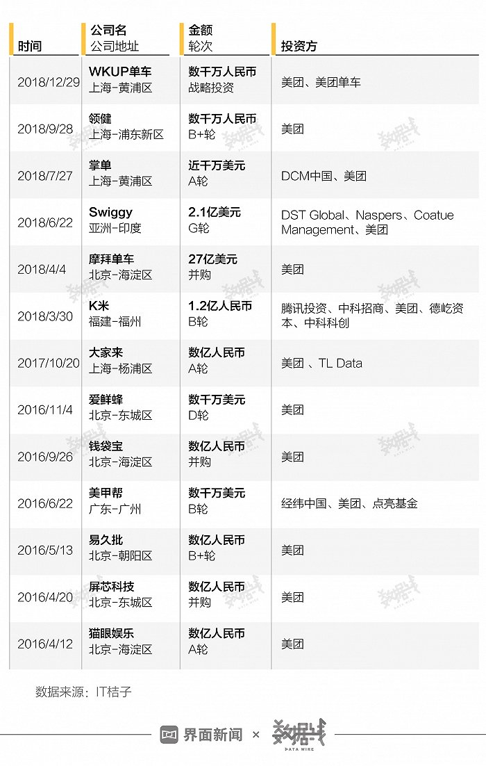 2015年10月至2018年12月美团战投投资梳理 界面新闻制图 数据来源:IT桔子