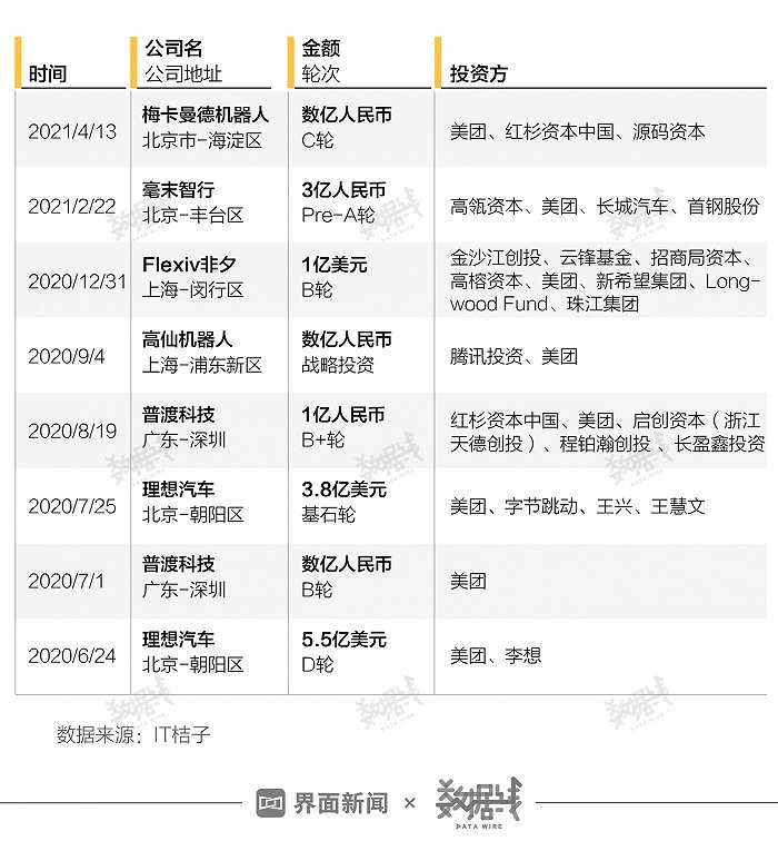 2020年至今美团战投涉及自动驾驶及机器人概念的投资事件 界面新闻整理 数据来源:IT桔子