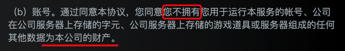 在我看来,这个账号和虚拟财产所有权属于厂商这个设定,是方便针对一些特殊情况的。