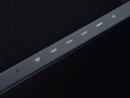 接口设计也比较有意思,主要接口集中在后侧,两侧较少。其中后侧接口分别为RJ45千兆网口、Type-C(USB3.2 Gen2+DP1.4+100W充电)、3×USB3.2 Gen1(其中一个支持5V2A关机充电)、HDMI2.1、电源接口;右侧接口分别为Type-C(USB3.2 Gen1)和摄像头电子开关;左侧接口分别为Type-C(USB3.2 Gen2+DP1.4)和3.5mm音频接口。3个Type-A和3个Type-C已经足够多了,而且新增的摄像头电子开关实用且美观。而且后侧接口还配备了指示灯,方便使用,甚至电源灯还能提示状态,比如充电时为红灯,停止充电为白灯,细节拉满。