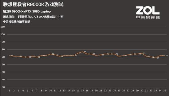 我还测试了新一代显卡杀手《赛博朋克2077》,在三种画质设置下进行测试,测试场景为开篇流浪者偷车,绕着车库走一圈,并记录帧率曲线。在2K、光线追踪:中等画质下,游戏帧率稳定在73帧左右;