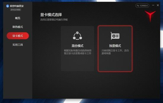 所有的测试均在野兽模式、独显直连下进行,野兽模式大家非常熟悉了,通过Fn+Q就可以轻松切换;独显直连可以在联想电脑管家中打开,可以提供更出色的游戏体验。当然日常办公的话,建议使用混合模式。需要注意一点,显卡模式切换后需要重启才能生效。