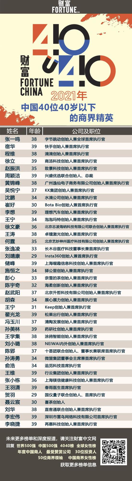 财富2021年中国40位40岁以下的商界精英榜:张一鸣、宿华、程维前三