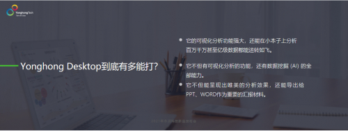 会议上,永洪向大家展示了Yonghong Desktop的突破性功能,比如Yonghong Desktop支持即装即用,本地自动更新,自动同步本地数据,可对接多种数据库,操作便捷,进行数据探索不再局限。并且能离线分析,在安全可控的前提下,用户可以下载并分析被授权的企业数据,移动办公从未如此简单。