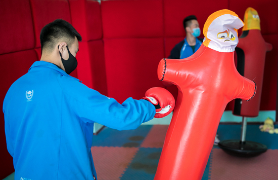 2020年4月9日,呼和浩特第26中学学生在情绪宣泄室击打“充气人偶”。视觉中国供图