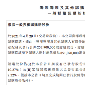 新浪科技讯 4月29日早间消息,中手游港交所公告称,4月29日,本公司与哔哩哔哩及其他两名认购人分别订立认购协议,据此,哔哩哔哩及其他认购人有条件地同意认购而本公司有条件地同 意配发及发行合共2.579亿股认购股份,占扩大后股份总数约9.32%,认购价为每股认购股份3.30港元。认购协议项下认购人应付总代价为8.51亿港元。本次配售完成后,哔哩哔哩将持有公司7.15%的股份。