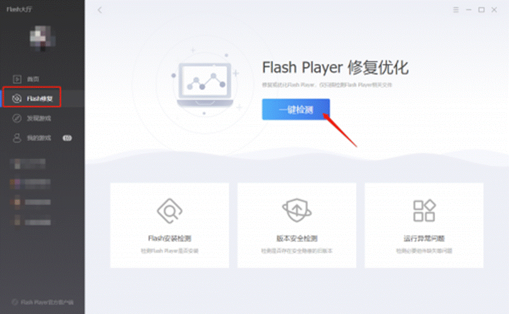 除此之外,还有一个更加简便的方法,下载Flash中国全新推出的包含Flash Player专用修复工具的Flash大厅软件。安装完成后,找到Flash修复频道,点击【一键检测】,如果检测中出现报错,选择【一键修复】即可解决问题,Flash Player可正常运行。