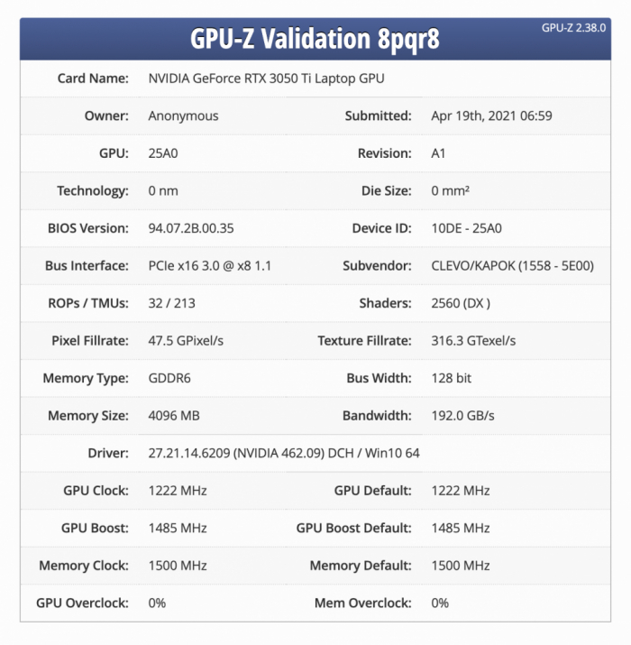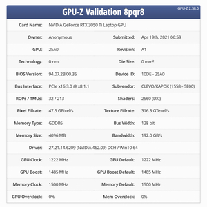 NVIDIA GeForce RTX 3050 Ti移动版规格已在GPU-Z验证中得到确认