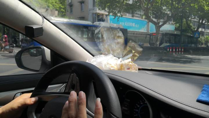 5月1日上午9点,一辆白色的长安停在我的跟前。核对完手机尾号,司机田师傅把手里的酱香饼搁在仪表台上,抱歉地说:“不好意思,出门没吃早饭,刚才路上买了点。”
