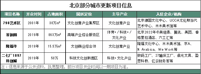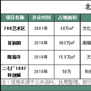 以首钢园为例,同样作为工业遗址改造项目,首钢园区占地面积863万平方米,约是798园区的29倍左右。首钢园承载着一片区域的转型发展功能,其在政策扶持方面优势突出,被纳入国家首批城区老工业区改造试点、国家服务业综合改革试点区、国家可持续发展实验区等。