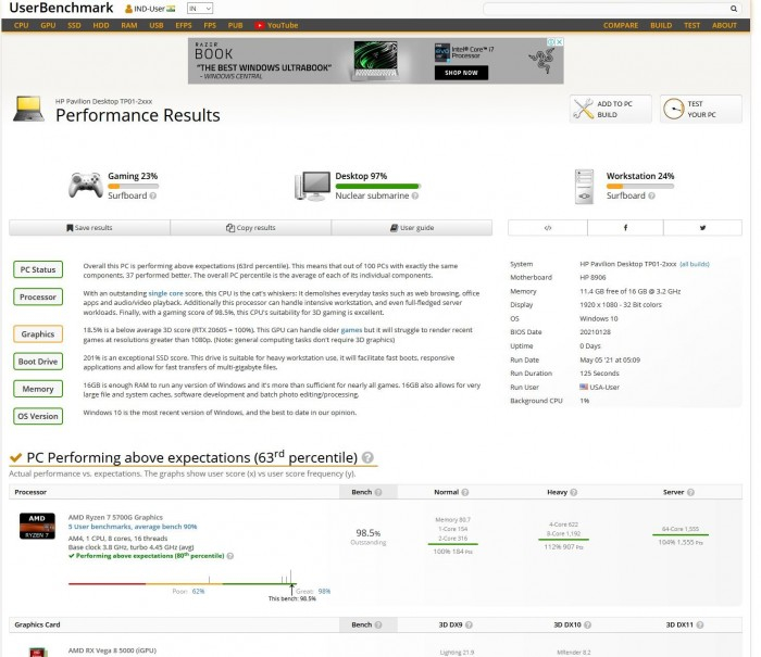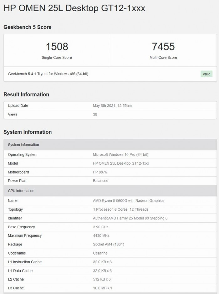 测试数据源自于内置在惠普OMEN 25L中的处理器Geekbench 5测试,它的综合性能在Core i5-11600K的90%左右,但在内存延迟方面落后。