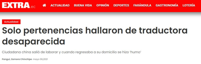 据厄瓜多尔当地媒体“extra”5月6日报道,一名在厄瓜多尔工作的中国女翻译近日失踪。