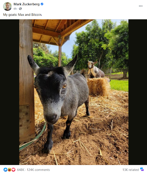 扎克伯格将他的山羊取名为“Max”和“比特币” 引发讨论