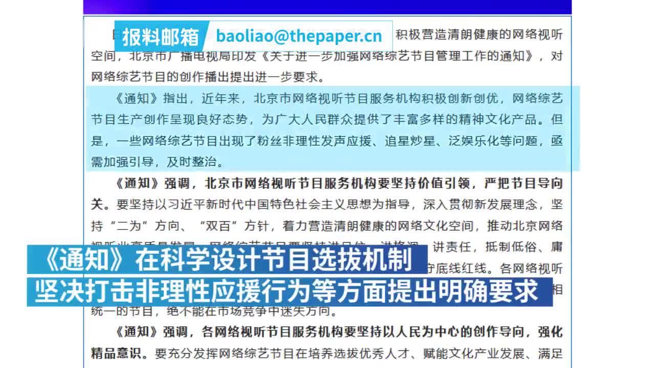 北京市广电局微信号“首都广播电视”发文,表示为进一步规范网络原创视听节目传播秩序,积极营造清朗健康的网络视听空间,对网络综艺节目的创作播出提出进一步要求。