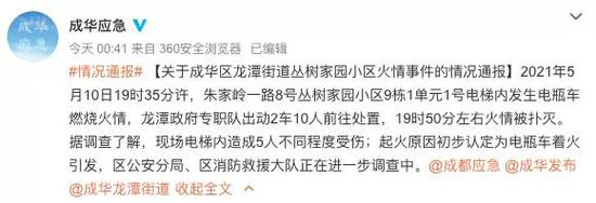 成华区应急管理局随后发布消息称,2021年5月10日19时35分许,朱家岭一路8号丛树家园小区9栋1单元1号电梯内发生电瓶车燃烧火情,龙潭政府专职队出动2车10人前往处置,19时50分左右火情被扑灭。目前,起火原因已经初步认定为电瓶车着火引发,成华区相关部门正在进一步调查中。截止到5月11日上午,记者了解到,事故中受伤的3人为中度烧伤,有一名老人和5个月大婴儿属重度烧伤,正在四川大学华西医院进行救治。