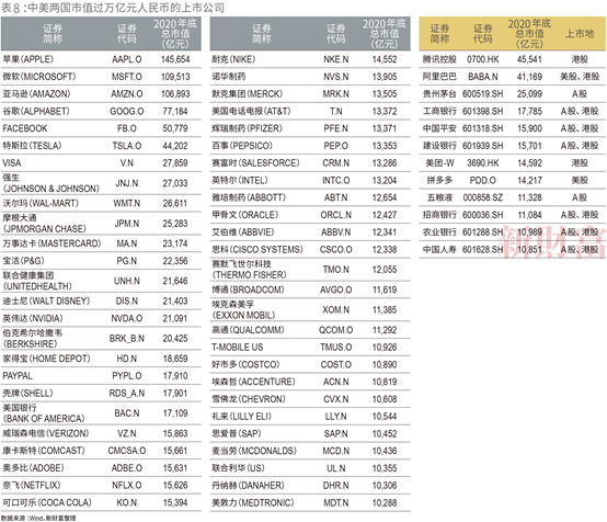 世界500强企业数量,中国超过美国,独角兽数量接近美国;但在资本市场,中国竞争力还在成长中。万亿元人民币以上市值的公司,美国51家,总市值123万亿元,中国仅有12家,总市值23万亿元,美国以互联网、科技、医药为主,中国一半为金融企业。A股独立打造的万亿市值公司仅有贵州茅台、五粮液两家。