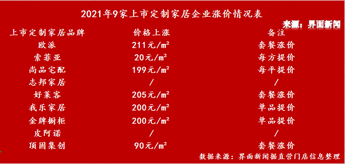 其次是好莱客、金牌橱柜、我乐家居,每平方米单价分别上涨205元、200元、200,皮阿诺和志邦家居是目前唯一没涨价的两家企业。
