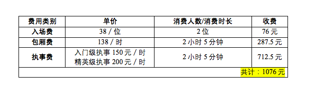 具体来看:标价138元/时的包厢收费287.5元;执事费(入门级执事150元/时,精英级执事200元/时)共计712.5元;入场费两人共计76元。