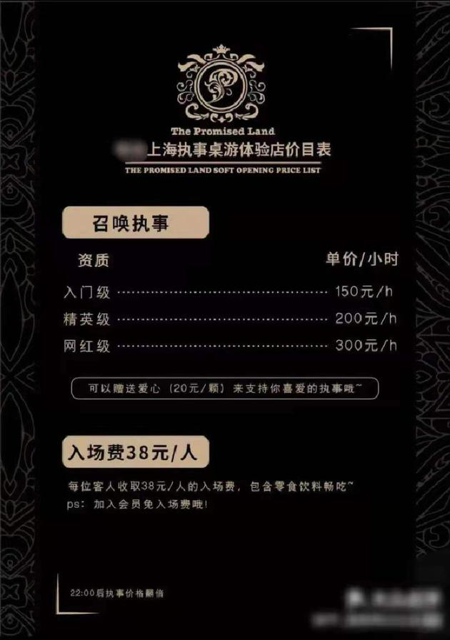 店内消费主要有三大板块:入门费、包厢费、执事费。入场费每人38元,店内提供饮料和小食;包厢费按包厢大小每小时100至200元;执事费用按入门级、精英级和网红级,分为150元、200元和300元。